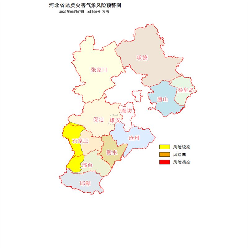 自8月7日20时至8月8日20时,保定市(阜平县)、石家庄市(平山县、灵寿县、行唐县、元氏县、赞皇县、高邑县、鹿泉区、井陉矿区、井陉县)、邢台市(临城县、内丘县、沙河市、信都区)发生崩塌、滑坡、泥石流等地质灾害风险较高(黄色预警)。上述地区有关责任单位和监测人员要做好地质灾害监测、巡查、转移避险等防范工作。